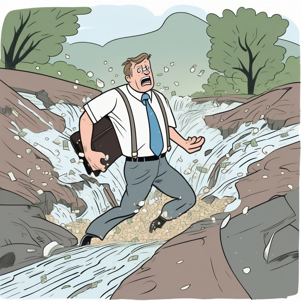 돈 가방 들고 급한 길에서, 갑작스런 홍수에 휩쓸려!