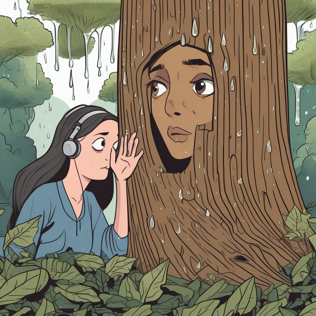 이브가 나무 뒤에서 즈드륵즐륵~ 떨어지는 물방울 소리에도 아랑곳하지 않고 남의 대화를 몰래 엿듣고 있어요!