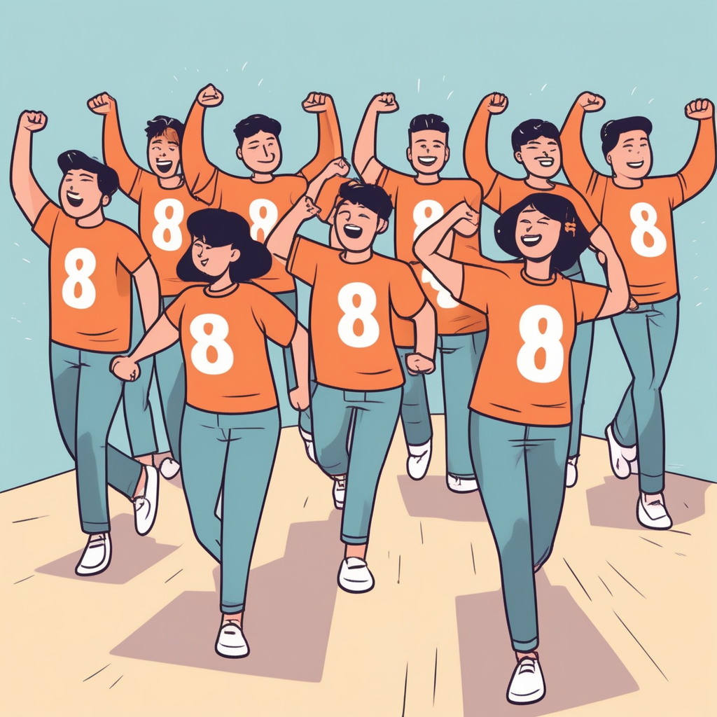 팔명이 한 줄로 서서 리더를 열렬히 따라간다!