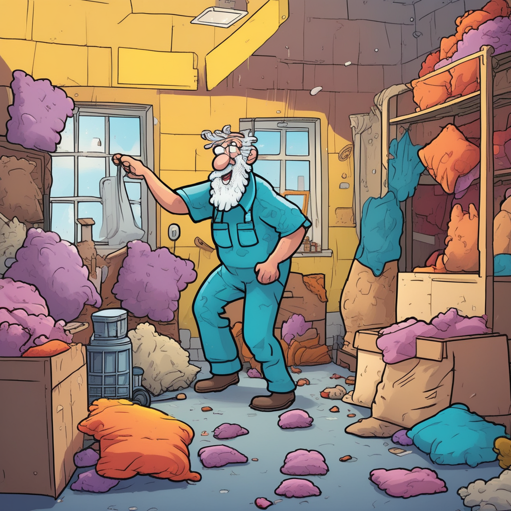 In the stuffy room, fluffy pillows dance as the scruffy janitor brings fresh air!