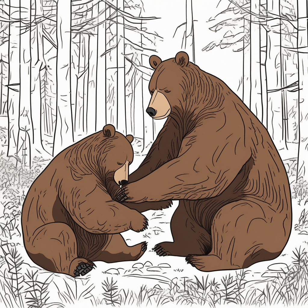 엄마 곰이 새끼를 꼭 베어안고 있고, 옆에서 배 아픈 곰이 꾹 참고 견디고 있어요!