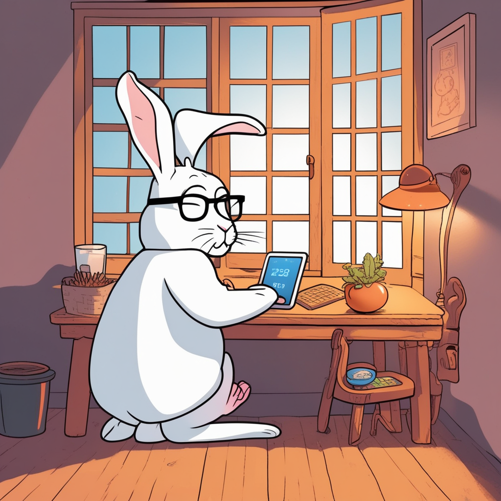 The rabbit checks its habit on a tablet!