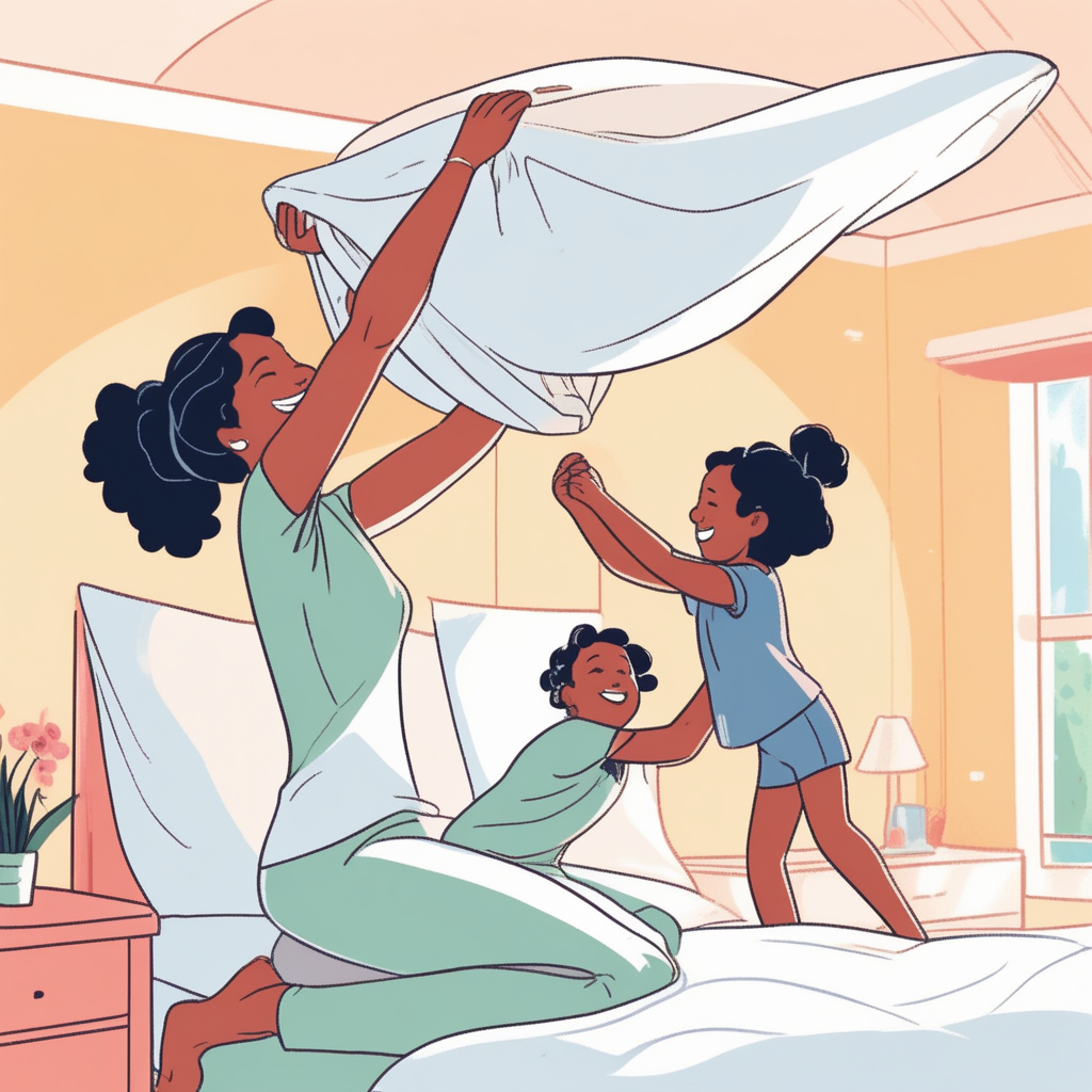 침대 시트를 펼치는 모녀