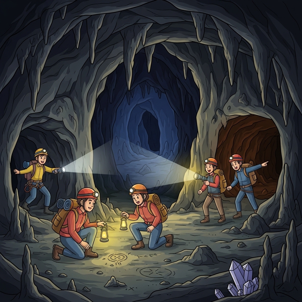탐험가들이 숨겨진 통로와 새로운 발견을 찾기 위해 신비한 동굴을 탐험한다.