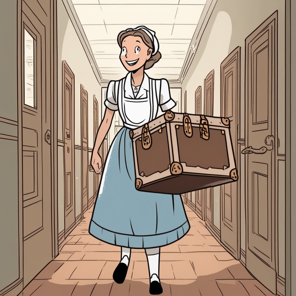 The matron in a maid's apron drags her huge trunk around, caring for all the students!