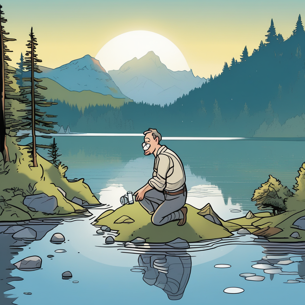 Sad person at the lake quenches their thirst!