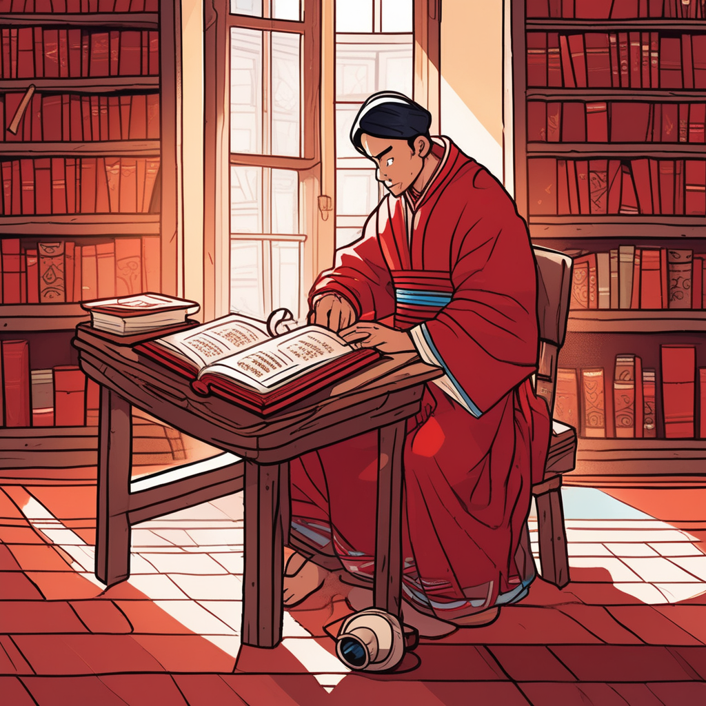 A scholar carefully perusing a red book from Peru, reading every word thoroughly!